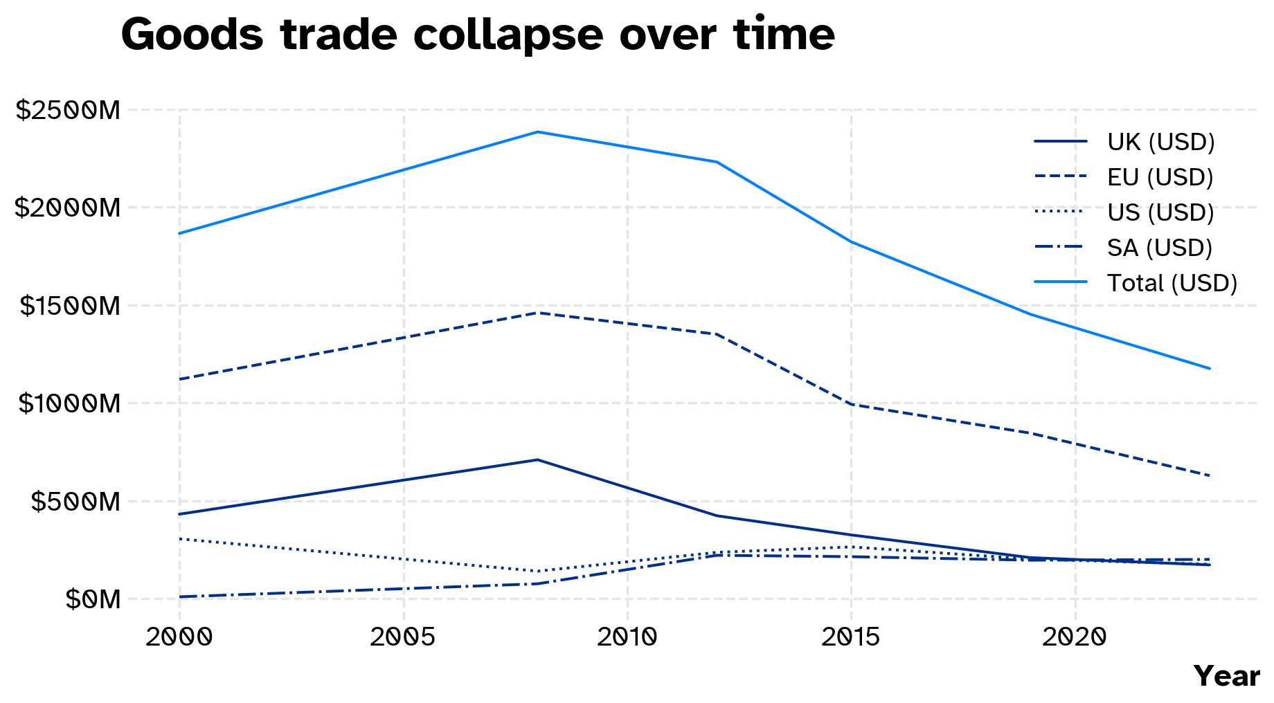 The EU’s external demand peaked in 2008 and started receding heavily in 2012 rather than recovering. That forced us into a recession because of what we call, a current account reversal although in 2013 statistics were embellished because elections were near so as to not show the logical effect of a current account reversal which is a sharp reversal in demand, and that embellishing has not stopped since today. We did not experience a real sudden stop because although demand waned, hot money flows did not recede from the global business sector (We are experiencing one now though since 2020). The only market we have made real progress is South Africa. So, our trade with South Africa has increased today, so much so that we are very much a periphery of the African core today, rather than our past role of being the periphery of Europe which was clearly short-lived and inefficient, because it rested principally on generous trade deals. Let us see using COMTRADE data how GOODS external demand panned out over time from these sources.