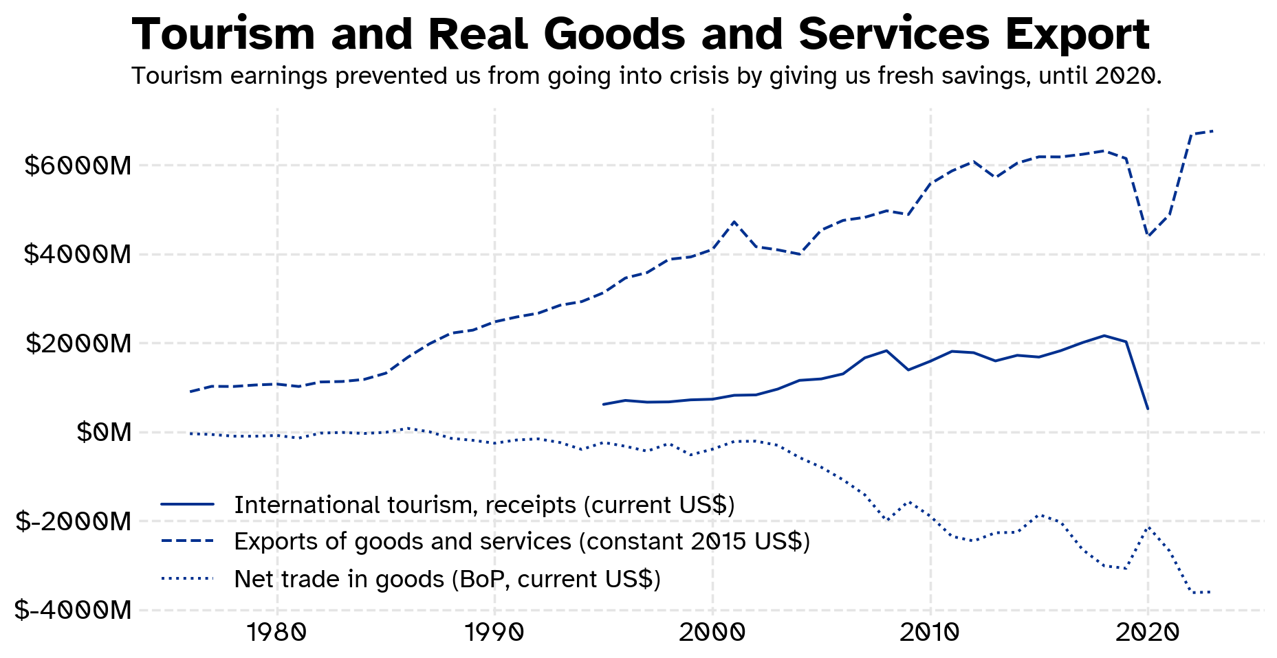 df = wb.data.DataFrame(['ST.INT.RCPT.CD','NE.EXP.GNFS.KD','BN.GSR.MRCH.CD'],['MUS'],time=range(1960, 2024, 1), labels=True,numericTimeKeys=True)df.set_index('Series', inplace=True)df = df.Tdf.plot(figsize=(11,5))plt.gca().yaxis.set_major_formatter(dollar)plt.legend(loc='best',fontsize=14)opinionated.set_title_and_suptitle('Tourism and Real Goods and Services Export','Tourism earnings prevented us from going into crisis by giving us fresh savings, until 2020.')