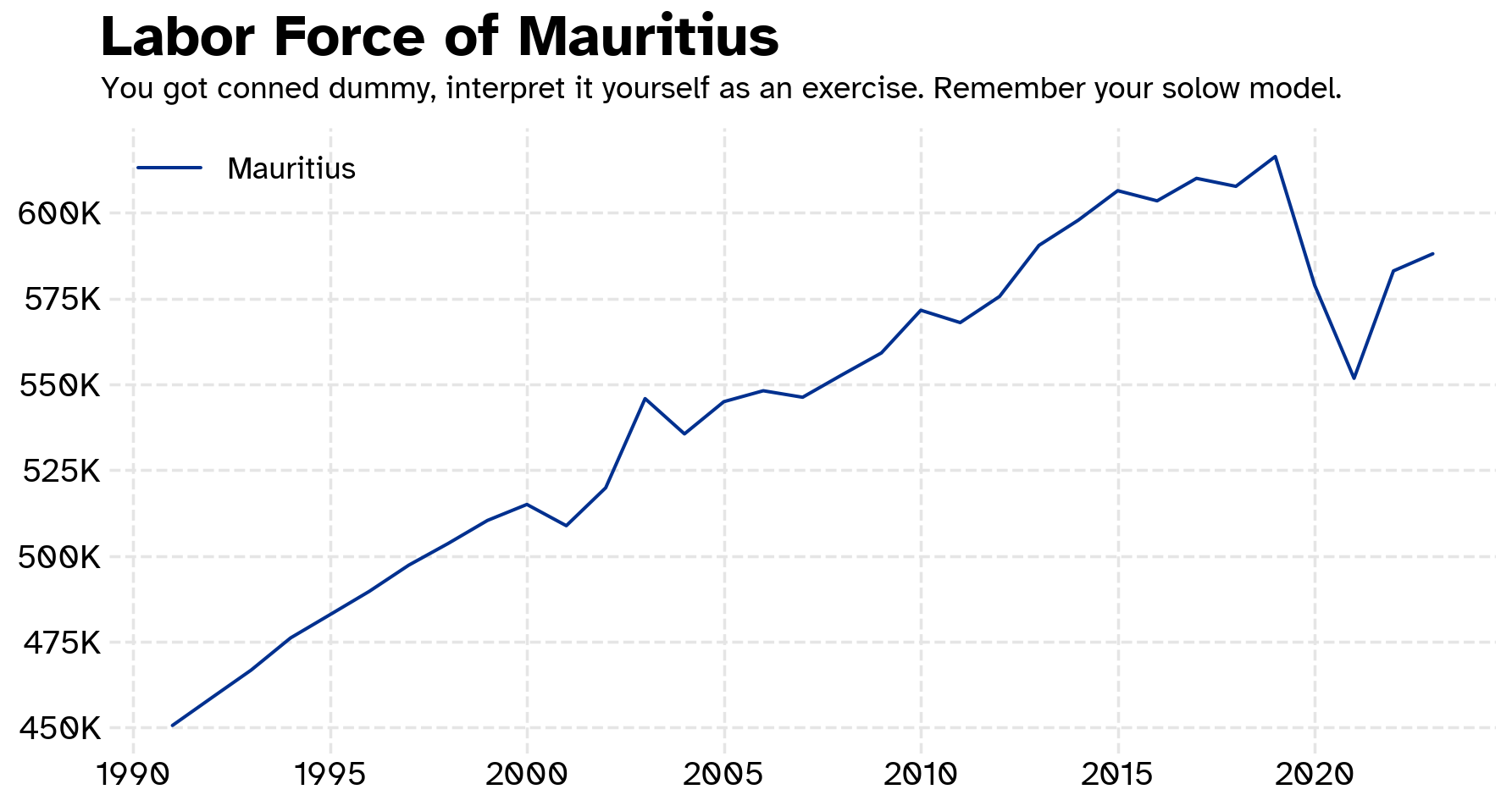 df2 = wb.data.DataFrame(['SL.TLF.TOTL.IN'],['MUS'],time=range(1960, 2024, 1), labels=True,numericTimeKeys=True)df2.set_index('Country', inplace=True)df2 = df2.Tdf2.plot(figsize=(11,5))plt.gca().yaxis.set_major_formatter(reformat_k)plt.legend(loc='best',fontsize=14)opinionated.set_title_and_suptitle('Labor Force of Mauritius','You got conned dummy, interpret it yourself as an exercise. Remember your solow model.')